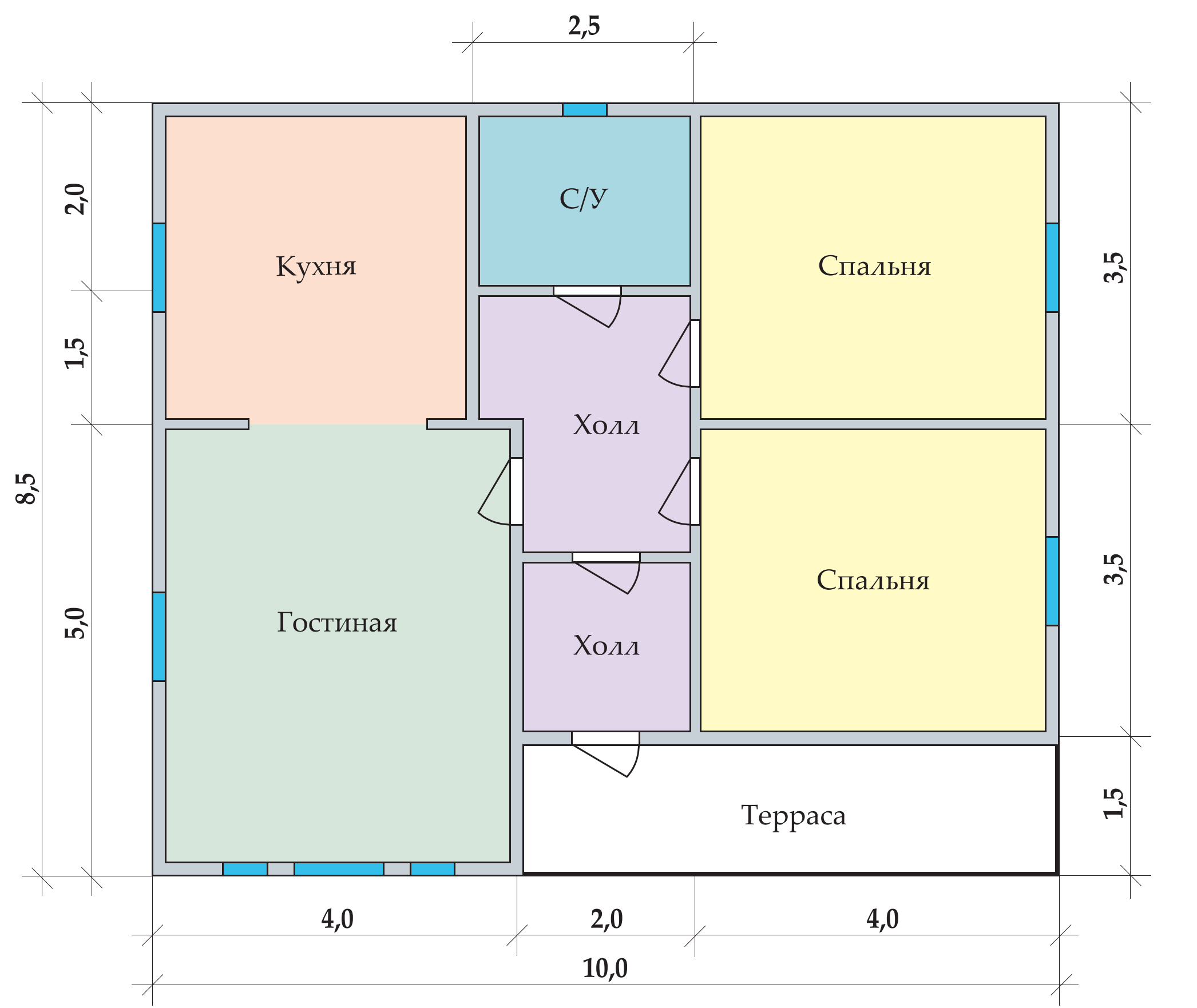 Входная группа с небольшой террасой, которую можно обустроить под летнюю площадку для отдыха. Дом встречает нас просторной прихожей. По правой стороне – две уютные спальни, по левой – светлая гостиная с выходом в кухню. Прямо по коридору – удобный санузел.